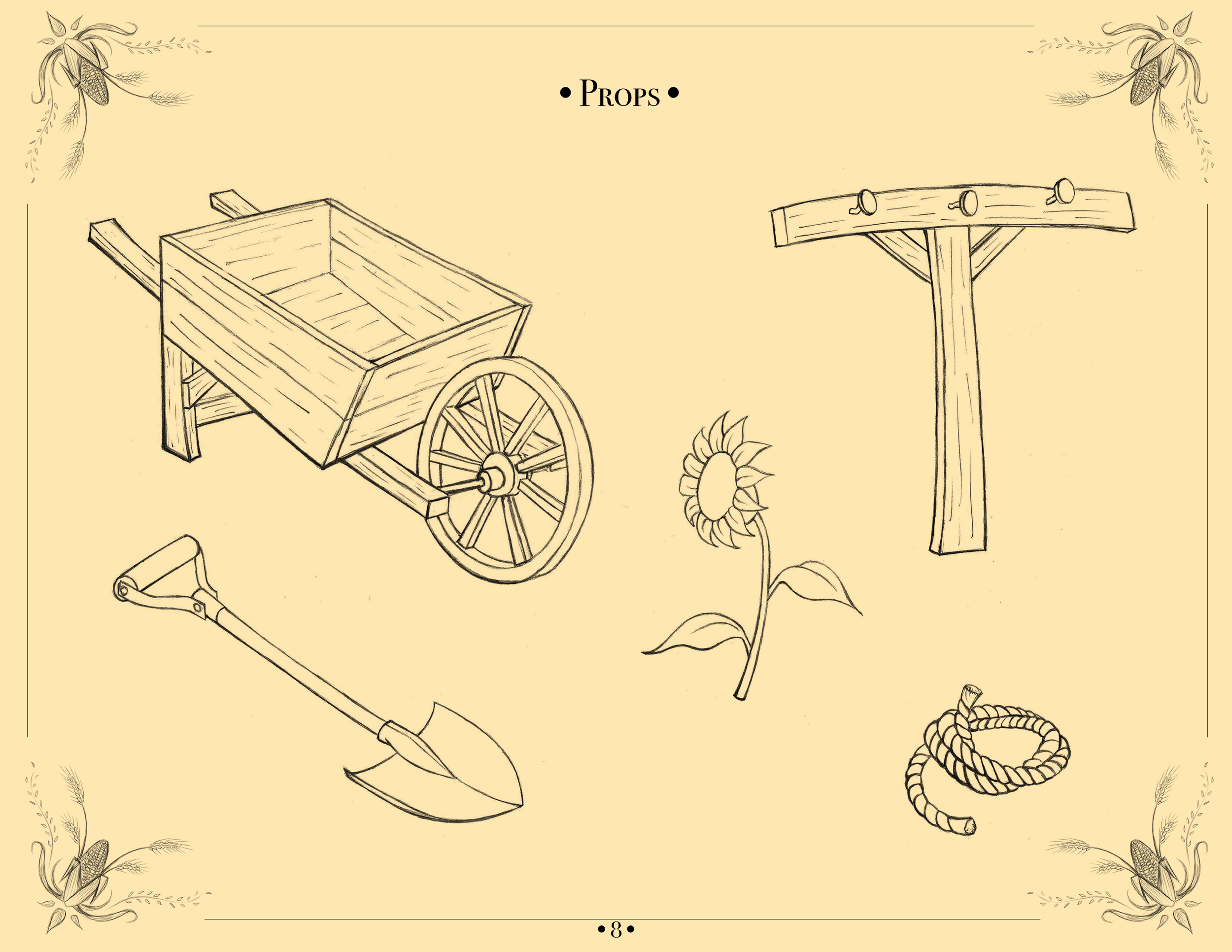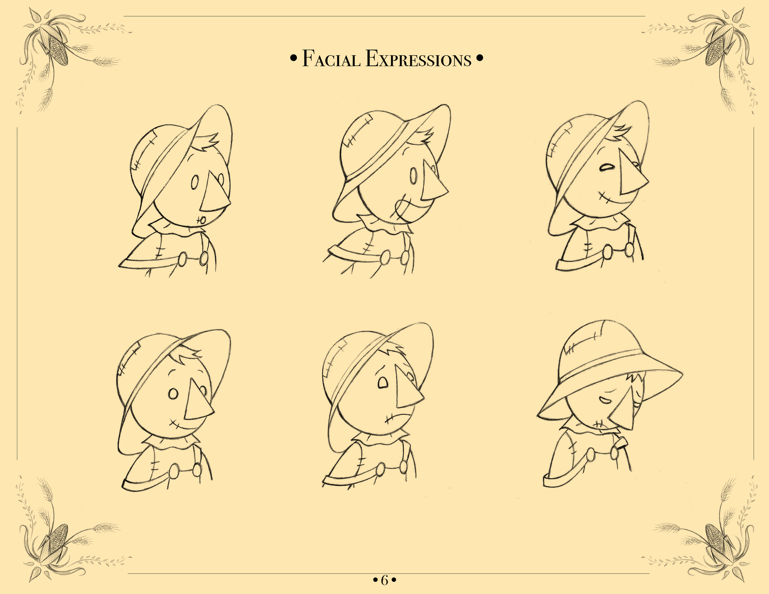 These images are from the very early days of the film where I had potential props for the scarecrow to encounter during his trek through the field, as well as his early designs. After drawing him several times, I decided to remove a lot of the detail from his outfit to make animation a bit easier. I also chose to make his eyes much larger so that I could create stronger expressions.